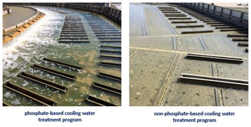FIG. 1. Compare a phosphate-based cooling water treatment program to a non-phosphate-based program. Challenges with algae growth and control disappear.