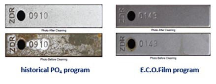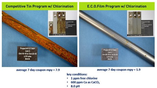 In some applications, a patented surface film formation catalyst (SFFC) enhances corrosion protection. This catalyst exclusively targets the metal surface (it is not found in the capping matrix) and helps develop a stronger passivated metal-oxide layer in corrosive water conditions. Typically fed at 92% lower levels than zinc and 96% lower levels than tin, the SFFC is an excellent choice for a non-phosphorus, environmentally conscious approach to treatment. In some applications, it has been documented that asset life (time to failure) can be 10–20 times longer due to the improved corrosion protection of E.C.O.Film (FIG. 4). Unlike tin technology, E.C.O.Film technology is halogen/oxidizer stable, so, it will continue to work and provide protection against harmful corrosion and deposition, regardless of how much hypochlorite or oxidizer is fed to control biological growth.