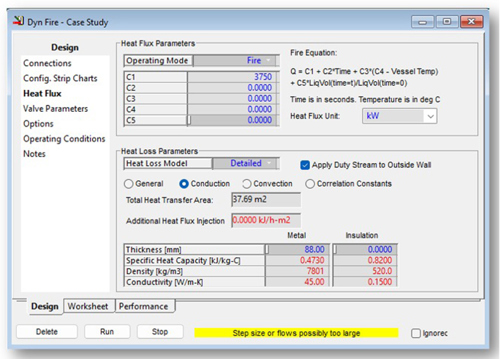 For this case study, a constant heat flux through the fire duration is considered by specifying C1, and setting C2, C3, C4, and C5 to zero. C1 is specified as such: API recommended heat flux for pool fire in (kW/m2) as tabulated in TABLE 3 multiplied by the heat transfer area (m2) resulting in applied heat in kW.