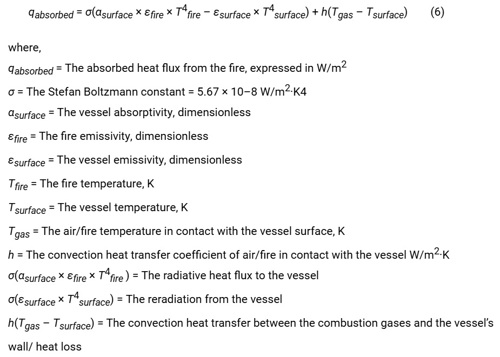 - Stefan Boltzmann Fire Mode (Eq. 6): This equation considers radiation and heat flow associated with natural convection at the vessel walls: