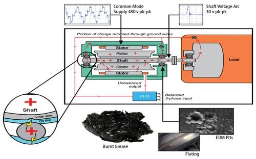A variable frequency drive (VFD) motor is an advanced electric motor controlled by a VFD that adjusts frequency and voltage for precise speed and torque control. This enhances energy efficiency, reduces wear through soft starting and improves process control in industrial applications. However, high initial costs and issues like electrical discharge (FIG. 1), which can damage bearings, are drawbacks. Despite these challenges, VFD motors remain popular for their efficiency, longevity and cost savings, making them a preferred choice for industries seeking optimized performance.