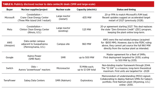 Data centers are energy-hungry and demand nearly 100% uptime. Currently, they rely on dual grid feeds plus backup diesel generators and UPS systems. Some operators are investigating SMRs to provide reliable, emissions-free power onsite (TABLE 6). The idea of a “nuclear battery” powering a data center remains an idea. While no data center has announced an SMR yet, companies like Microsoft have shown interest through hires and research into microreactors. Another remote application is telecom or observation outposts, where microreactors could replace large solar and battery setups currently used for reliability.