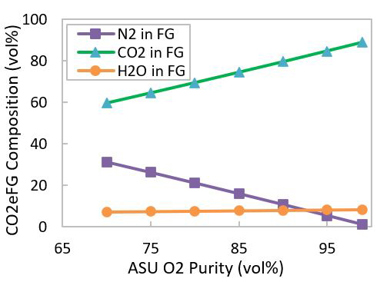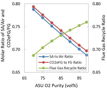 The composition of SA and CO2eFG depends on the purity of the O2 stream from the ASU and the flue gas recycle ratio. A few possible SA compositions and the corresponding CO2eFG composition are given in FIGS. 2 and 3, respectively. Air with 4 vol% moisture and 5.9 wt% coke yield with 6 wt% H2 content in coke are considered for these calculations.