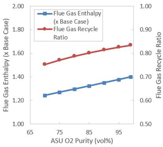 As seen in FIGS. 4 and 5, the MW and Cp of SA and CO2eFG increases by as much as 35%–40% in oxy-combustion. The enthalpy of CO2eFG also increases in the same proportion. The SA requirement also reduces significantly due to higher O2 levels.