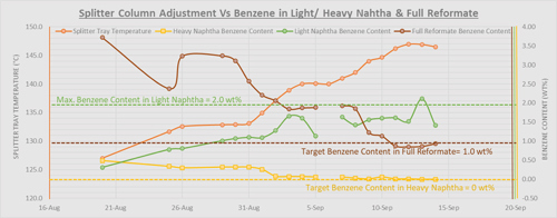 Several milestones for conducting tests have been reached, including tank inventories for test preparations to unit feed adjustments, optimizations of columns and conversion enhancements of reactors. FIG. 8 shows a portion of the test run, detailing how column tray temperature adjustments changed the benzene concentration in light and heavy naphtha and reformate products.