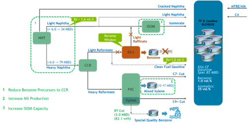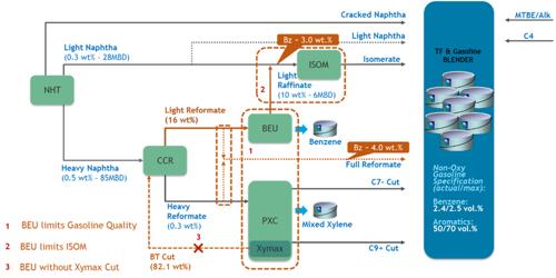 2. BEU hydraulic constraints. Given the BEU’s inability to process light reformate effectively, the unit was preserved for mothballing, with preparations underway for a major revamp. In the interim, heavy reformate was rerouted to the PXC, which was expected to increase mixed xylene production by 12,000 bpd–17,000 bpd and eliminate throughput constraints in the ISOM unit.