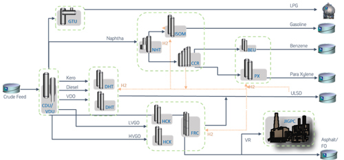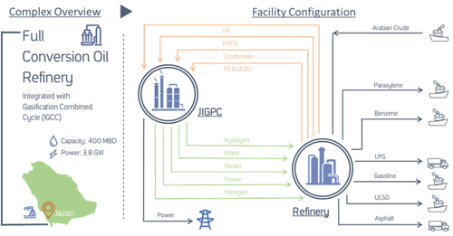 Background. Saudi Aramco’s 400,000-bpd Jazan Refinery Complex (JZRC) is a full conversion oil refinery that processes Arabian crude oil. It is integrated with a 3.8-GW vacuum residue (VR) gasification power block, called the Jazan Integrated Gasification and Power Company (JIGPC), which produces hydrogen (H2), steam and other necessary utilities like nitrogen, oxygen, etc., to sustain refinery operations. This configuration is detailed in FIG. 1.