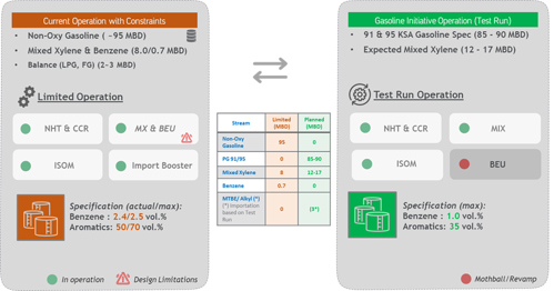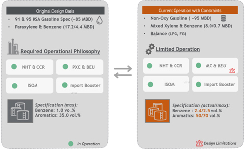 The JZRC was initially designed to produce high-octane, clean-fuel gasoline for domestic consumption and generate petrochemical intermediates such as benzene and PX for export. However, design limitations in the aromatics complex—particularly in the BEU and PXC—hindered the refinery’s ability to meet evolving Saudi Clean Fuels specifications, which mandate benzene levels < 1 vol% and aromatics < 35 vol% (FIG. 3).