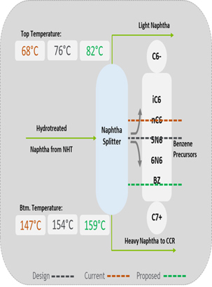 1. High benzene in the light reformate. To compensate for the absence of the benzene-toluene cut to the BEU, the NHT splitter was planned to be optimized for directing C6 hydrocarbons (benzene precursors) to the CCR feed. Post startup of the ISOM unit, NHT splitter adjustments were made that redirected benzene and 90% of the precursors to the light naphtha stream. Simulationsa confirmed benzene reduction in the reformate from 4 wt% to < 1 wt%, meeting clean fuels standards.