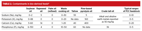 Catalyst inventory. As mentioned above, bio-derived feedstocks will introduce known or new catalyst poisons and inhibitors into the FCCU. These contaminants include alkali and alkaline earth elements and phosphorus (TABLE 2).