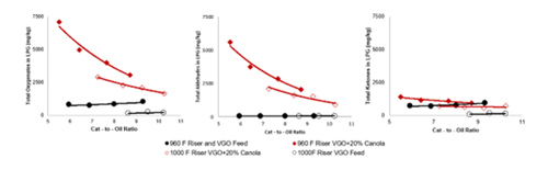 This pilot plant study demonstrated that aldehydes increase more than ketones. In addition, aldehydes have a stronger correlation to FCC severity, with the cat-to-oil ratio influencing aldehydes to a greater degree than reactor temperature. Additionally, it is important to note that aldehydes are not typically observed in FCC products in appreciable amounts without coprocessing oxygen-containing feedstock. So, not only does oxygenate content increase, but there is also the introduction of a compound that is not widely encountered in normal FCCU operations.