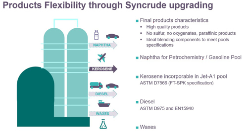 Final products meet industry and transportation standards, specifically ASTM D-7566 for kerosene. The absence of sulfur, nitrogen and aromatics create final product blending values relative to their fossil-based counterparts. Multiple upgrading schemes provide the flexibility to produce a wide product slate, including petrochemical grade naphtha, renewable diesel, sustainable aviation fuel (SAF) and specialty products (waxes or base oils).