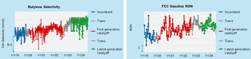 FIG. 7 highlights the large increase in butylene selectivity and the increase in the gasoline’s RON achieved through the catalyst changes.