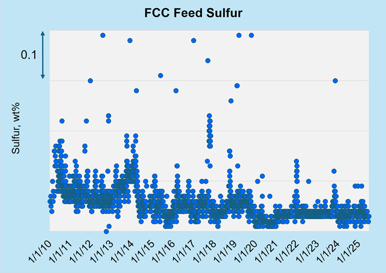FIG. 3. Unit A’s FCCU feed sulfur decreasing over the years due to increased hydrotreating to meet Tier 3 gasoline sulfur specifications.