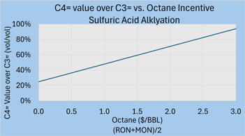 For example, if a refinery has zero octane incentive, then C4= should be 25% higher than C3=, not accounting for acid cost or refrigeration limits. If a refinery has $1.50/bbl octane incentive, then C4= are valued 60% above C3=. This shows C4= are the preferred feedstock an FCCU should make for alkylation.