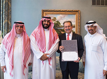 His Royal Highness, the Deputy Crown Prince of Saudi Arabia, Mohammad Bin Salman Al Saud, presented the trading license directly to Andrew Liveris, Dow's chairman and CEO, at the Royal Embassy of Saudi Arabia in Washington, D.C. In attendance was Dr. Majid bin Abdullah Al Qasabi, Minister of Commerce and Investment, and Khalid Al-Falih, Minister of Energy and Mineral Resources of Saudi Arabia and chairman of Saudi Aramco.