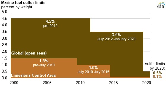 The sulfur content of transportation fuels has been declining for many years as a result of increasingly stringent regulations. In the United States, federal and state regulations limit the amount of sulfur present in motor gasoline, diesel fuel, and heating oil. New international regulations limiting sulfur in fuels for ocean-going vessels, set to take effect in 2020, have further implications for both refiners and vessel operators at a time of high uncertainty in future crude oil prices, which will be a major factor in their operational decisions.