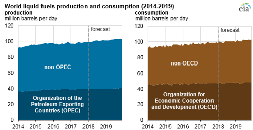 Global consumption of petroleum and other liquid fuels grew by 1.4 million b/d in 2017, reaching an average of 98.4 MMbpd for the year. EIA expects consumption growth will average 1.7 MMbpd in 2018 and 1.6 MMbpd in 2019, driven by the countries outside of the Organization for Economic Cooperation and Development (OECD). Non-OECD consumption growth is expected to account for 1.2 MMbpd and 1.3 MMbpd of the growth in 2018 and 2019, respectively.