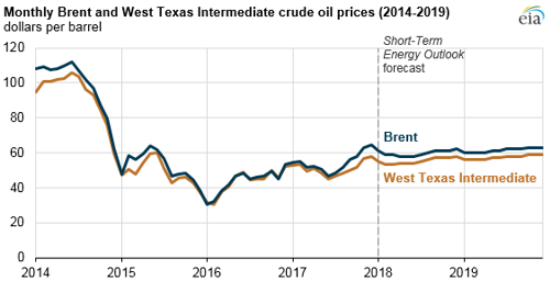 EIA’s January Short-Term Energy Outlook forecasts Brent crude oil to average $60 per barrel (b) in 2018 and $61/b in 2019, slightly higher than the $54/b average in 2017. In both 2018 and 2019, EIA expects total global crude oil production to be slightly greater than global consumption, with U.S. crude oil production increasing more than any other country.