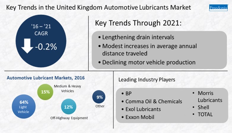 Improved engine technologies and high-quality lubricant formulations that will continue to lengthen average drain intervals will play a part in this decline. These and other trends are presented in Automotive Lubricants Market in the UK, a new study from The Freedonia Group, a Cleveland-based industry research firm.