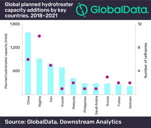 Analysis of hydrotreater capacities for global refineries shows that China has the highest capacity globally with 1,591.8 thousand barrels per day (mbd) to be added between 2018 and 2021. Nigeria and Iran follow with 919.6 Mbpd and 789.7 Mbpd added respectively by 2021, according to GlobalData, a leading data