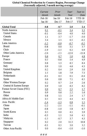 WASHINGTON– Data collected and tabulated by the American Chemistry Council show that growth in global chemical production continued on a soft note in February. The American Chemistry Council’s Global Chemical Production Regional Index (Global CPRI) indicates that global chemicals production fell 0.8 percent in February, following a revised 0.7 percent drop in January and a 0.3 percent gain in December. Note that all data are on a three-month moving average (3MMA) basis.