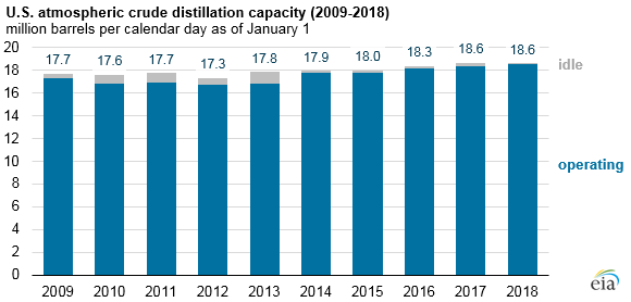 As of January 1, 2018, U.S. operable atmospheric crude distillation capacity totaled 18.6 million barrels per day (MMbpd), a slight decrease of 0.1% since the beginning of 2017 according to EIA’s annual Refinery Capacity Report. Annual operable crude oil distillation unit (CDU) capacity had increased slightly in each of the five years before 2018.