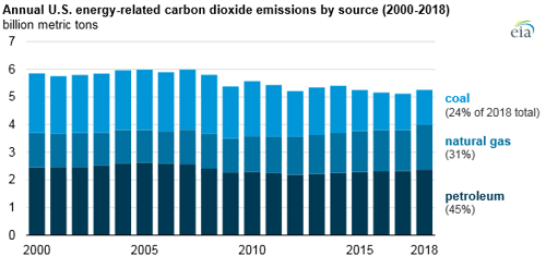 Total U.S. energy-related carbon dioxide (CO2) emissions in 2018 rose to 5.27 B metric tons, 2.7% more than its 2017 level. The primary reasons for the increase were higher natural gas-related emissions resulting from more extreme summer and winter weather and growth in transportation-related petroleum emissions, linked to a strong economy. U.S. energy-related CO2 emissions declined in 6 of the past 10 years and were 12% lower in 2018 than in 2005, according to a data series published in the U.S. Energy Information Administration’s (EIA) Monthly Energy Review.