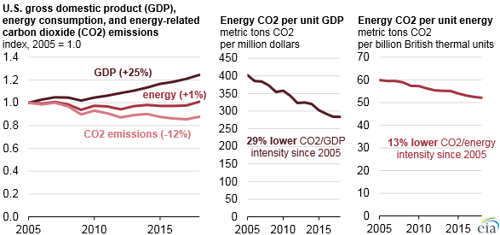 From 2005 to 2018, the U.S. economy grew by 25% while U.S. energy consumption grew by 1%. Energy-related CO2 emissions as of 2018 were 12% lower than their 2005 levels. The economic growth that occurred in 2018 was 29% less carbon-intensive than it was in 2005, and the overall energy consumption in the United States was 13% less carbon-intensive.