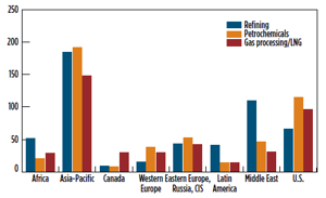 In 2020, the hydrocarbon processing industry’s capital, maintenance and operating budgets are expected to reach nearly $440 B. Asia continues to invest heavily in all areas of the downstream sector. This buildout includes additional capacity to satisfy demand for transportation fuels, petrochemicals and natural gas. With the continued increase in shale gas production, the petrochemical and gas processing/LNG industries in the U.S. continues to witness capital-intensive capacity builds in midstream and downstream projects, such as ethylene and ethylene derivative units, methanol and ammonia/urea plants, gas processing and natural gas pipeline infrastructure and LNG liquefaction trains/export facilities. The Middle East is investing heavily in boosting its downstream products portfolio—low-sulfur and ultra-low-sulfur (ULS) transportation fuels and high-valued petrochemical products—and significantly increasing gas processing capacity and natural gas logistics infrastructure.