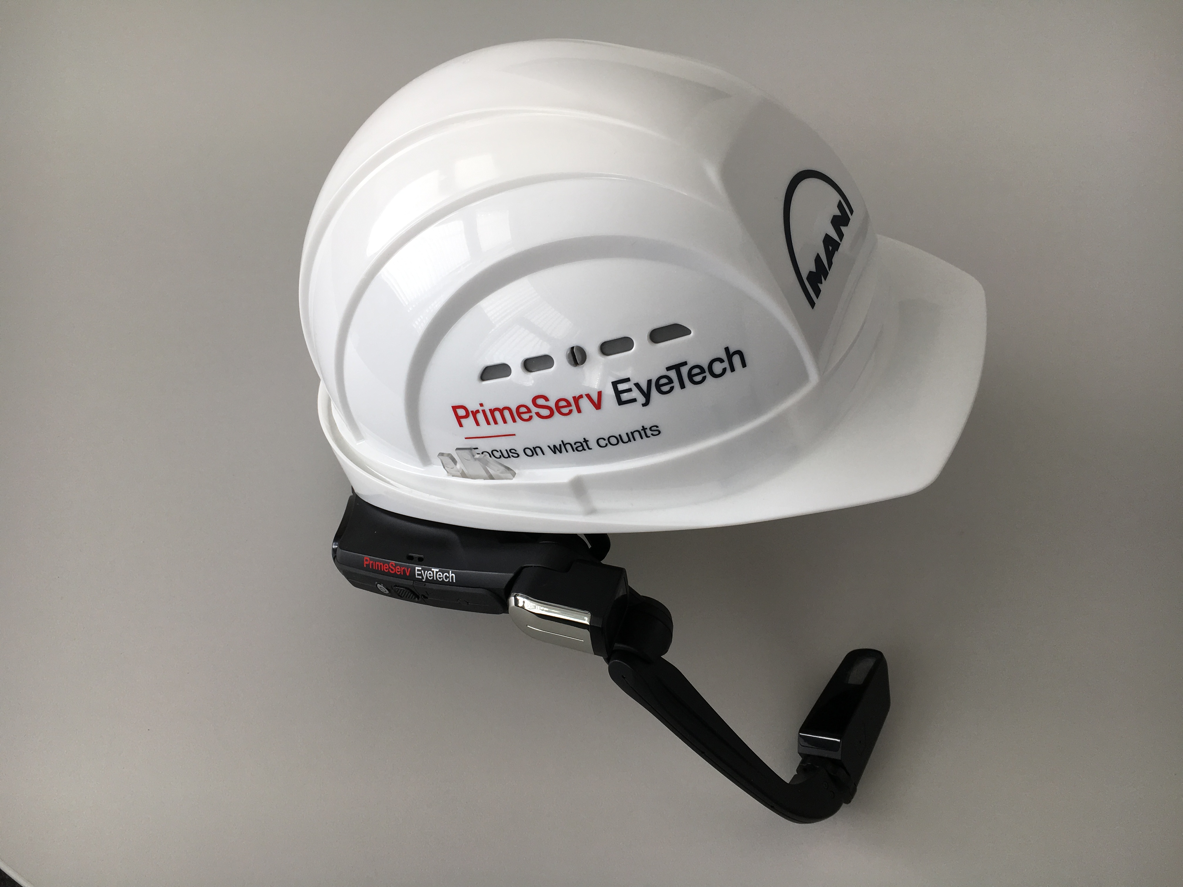 PrimeServ EyeTech combines a safety helmet with a camera, micro screen, microphone and headphones. The camera mounted on the helmet enables the MAN expert to see on screen what the technician sees on site and to guide the technician visually and acoustically through maintenance processes. Additional information is provided to the customer via a helmet display.