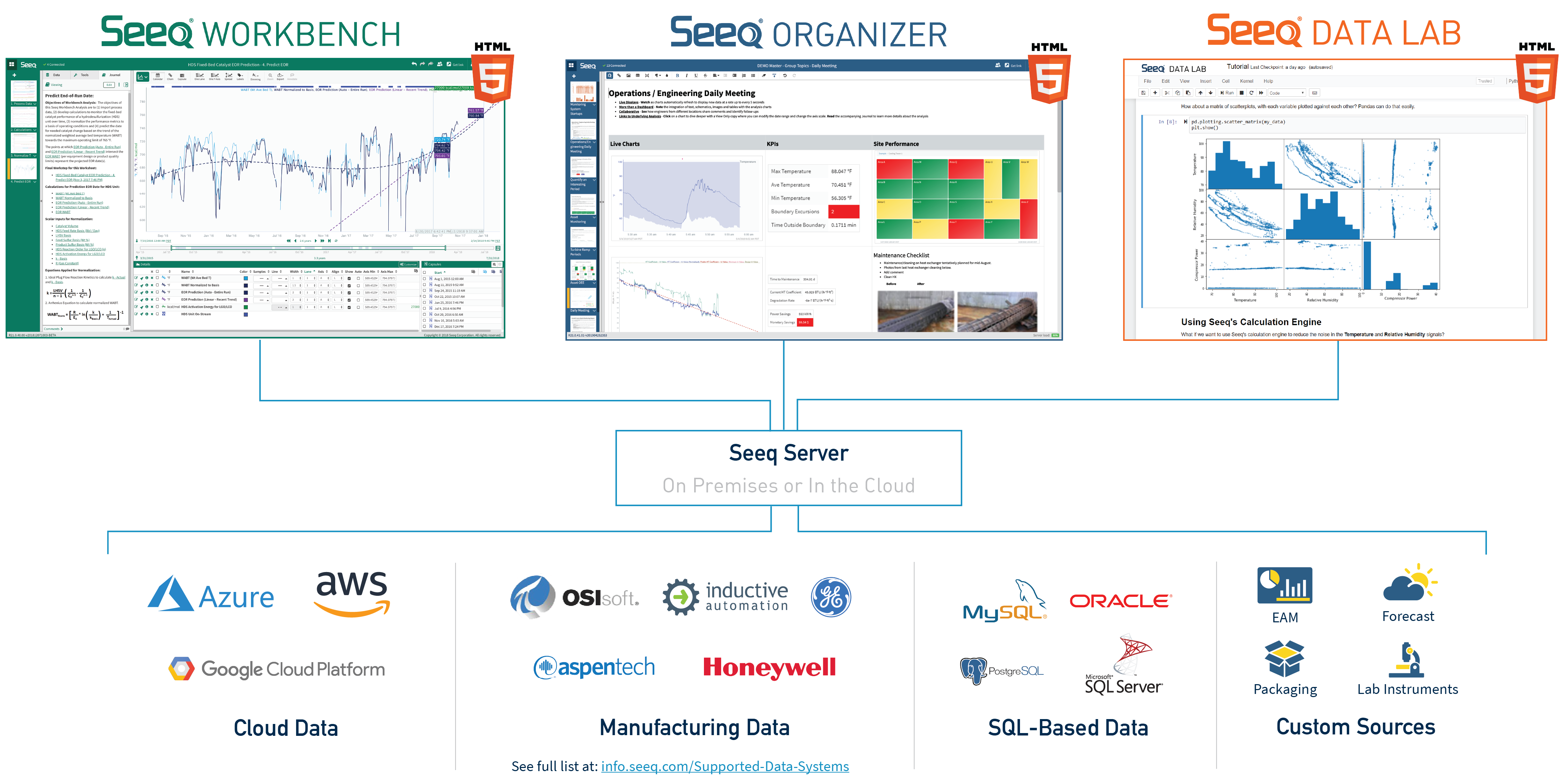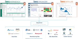 All of the browser-based Seeq applications – Organizer, Workbench, and Data Lab – connect to a shared Seeq server to enable collaboration, access connected data sources, and enable administrative control. For example, graphics created in Data Lab may be viewed in Organizer Topics, data modeled in Workbench may be accessed by Data Lab users, and Data Lab algorithm results are available for use in the other Seeq applications. Example use cases for process engineers and data scientists using Seeq Data Lab include;