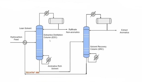 GT-BTX takes pygas, reformate and coke oven light oil streams to efficiently extract aromatics via extractive distillation (ED) in a two-column system (see Fig. 1). The use of the Techtiv 500 solvent in the GT-BTX process makes it among the highest-efficiency ED processes. GT-BTX is in use in more than 60 grassroots and revamp units around the world, and is the only ED technology that can extract high-purity benzene, toluene and xylene (BTX) together at more than 99.9% recoveries.
