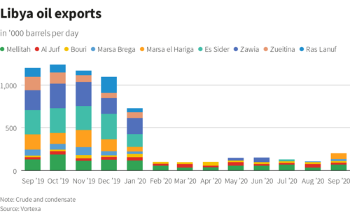 The easing of a blockade by eastern forces, which had cut output by more than 90% to around 100,000 bpd, has seen production recover to about 500,000 bpd. The government in Tripoli expects that to double by year-end.