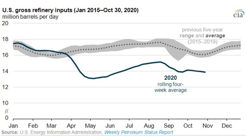 Since April, when responses to the 2019 novel coronavirus disease (COVID-19) reduced demand for refined products such as gasoline, distillate fuel, and jet fuel, gross inputs of crude oil and other raw materials to U.S. refineries (refinery runs) have been lower than the five-year range (2015–19). Although runs have increased compared with their April lows, the continued effects of the pandemic, in addition to seasonal factors, have resulted in continued lower refinery runs. As of October 30, U.S. refinery runs were 14.0 MMbpd, or about 13% lower than the average for this time of year, according to the U.S. Energy Information Administration’s (EIA) Weekly Petroleum Status Report.