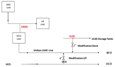 Option 4: Using low-sulfur ARDR, ULSD and UCO. MAB had successfully completed the trial run for the lab blend with ARD residue and mix of TGO and UCO to produce low-sulfur fuel oil. However, the blend viscosity was around 20 cSt–40 cSt. The initial blended batch was stable and the desired results were achieved. However, compatibility issues were observed in the subsequent batches. Executing the modifications shown in FIG. 5, MAB successfully prepared the first batch of VLSFO.