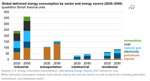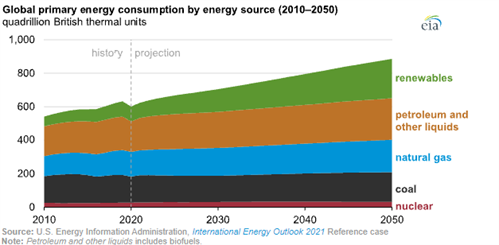 In the International Energy Outlook 2021 (IEO2021) Reference case, the EIA projects that, absent significant changes in policy or technology, global energy consumption will increase nearly 50% over the next 30 yrs. Although petroleum and other liquid fuels will remain the world’s largest energy source in 2050, renewable energy sources, which include solar and wind, will grow to nearly the same level.