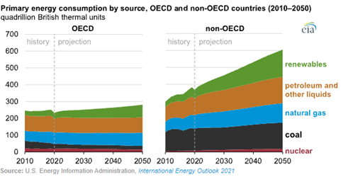 Falling technology costs and government policies that provide incentives for renewables will lead to the growth of renewable electricity generation to meet growing electricity demand. As a result, renewables will be the fastest-growing energy source for both OECD and non-OECD countries. The EIA projects that coal and nuclear use will decrease in OECD countries, although the decrease will be more than offset by increased coal and nuclear use in non-OECD countries.