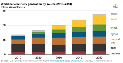 In the Reference case of the EIA's International Energy Outlook 2021 (IEO2021), where they assume current laws and regulations continue into the future, the EIA projects that renewable resources—particularly solar and wind—will be the largest contributor to the growth in electricity generation through 2050. However, certain regions will still mainly use coal resources for electricity generation.