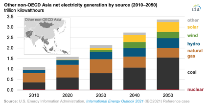 Increases in coal-fired generation in Other non-OECD Asia—which includes Indonesia, Vietnam, and Thailand, among other countries—will account for over 75% of the EIA's projected increase in global coal-fired generation from 2030 to 2050. For Other non-OECD Asia, the EIA projects that renewable energy sources will account for about 60% of the generation increase over the projection period, primarily from wind and solar. Coal-fired generation will account for nearly all of the remaining growth.