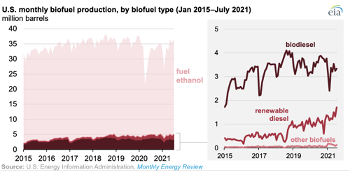 - Fuel ethanol accounted for 86% of total U.S. biofuels production in July 2021, biodiesel for 9%, renewable diesel fuel for 5%, and other biofuels for less than 1%.