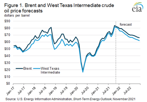 The EIA forecasts that crude oil prices will begin declining in November 2021 and will decline through 2022. We expect that the price of WTI will fall from an average of $76/b in January 2022 to $62/b in December and that the price of Brent will fall from $79/b in January 2022 to $66/b in December.