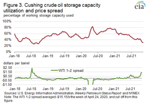 On November 5, US crude oil inventories were 435.1 MM bbl, 6% below the previous five-year (2016–2020) average. Crude oil inventories in Cushing, however, were 26.4 MM bbl, 50% below the previous five-year average and 31% of the working storage capacity (the lowest share since September 2018). Backwardation over the short term (first- and second-month contracts) reflects the low inventory levels. A shift in crude oil flows away from Cushing while the Capline pipeline is being filled is likely contributing to low crude oil inventories in Cushing. The Capline pipeline is expected to reverse the flow direction to move crude oil to the U.S. Gulf Coast in early 2022.