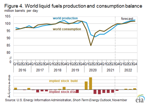 Since the third quarter in 2020, global demand for crude oil and petroleum products has increased faster than production, which has led to inventory draws and increasing crude oil prices. In February 2020, before the World Health Organization declared COVID-19 a pandemic, the spot price for Brent crude oil averaged $56 per barrel (b) and $51/b for West Texas Intermediate (WTI). The spot prices for Brent fell to $18/b and WTI to $17/b in April 2020 because of the significant decline in demand caused by the pandemic. Prices have since increased and are now above pre-pandemic levels because of returning demand and slow global oil production growth. In October, the price of Brent crude oil averaged $84/b, and the price of WTI averaged $81/b, the highest nominal prices since October 2014. In the EIA's November Short-Term Energy Outlook (STEO), they forecast that global liquid fuels inventories will begin building in 2022, driven by rising production from OPEC+ and the United States, which will contribute to falling crude oil prices.