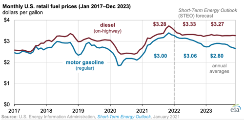 The EIA expects that slower demand growth and increasing crude oil production through 2022 and 2023 will contribute to lower crude oil and petroleum product prices. Crude oil prices are the largest driver of retail gasoline and diesel fuel prices.