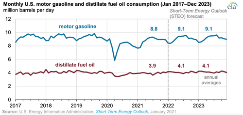 Distillate fuel oil consumption (much of which is consumed as diesel) decreased from 4.1 MMbpd in 2019 to 3.8 MMbpd in 2020. In 2021, the EIA estimates consumption increased to 3.9 MMbpd. They expect distillate demand will return to just below 2019 levels in 2022.