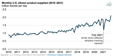 The EIA expects U.S. ethane consumption to average 2.1 MMbpd in both 2022 and 2023 because another ethylene cracker was recently completed in Monaca, Pennsylvania, which will add an estimated 96,000 bpd of ethane feedstock capacity, and existing ethylene crackers should operate at higher utilization rates.