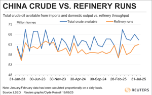 China's refiners lifted their processing rates in July, but strong crude oil imports and domestic output meant there was still a surplus of more than .5 MMbpd available for storage.