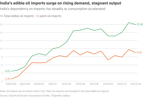 Edible oil imports have climbed to 16 million tons in 2023-24 from 4.4 million tons two decades ago, making India the world's largest buyer of vegetable oils such as palm oil from Indonesia and Malaysia and soy oil and sunflower oil from Argentina, Brazil, Russia, and Ukraine.