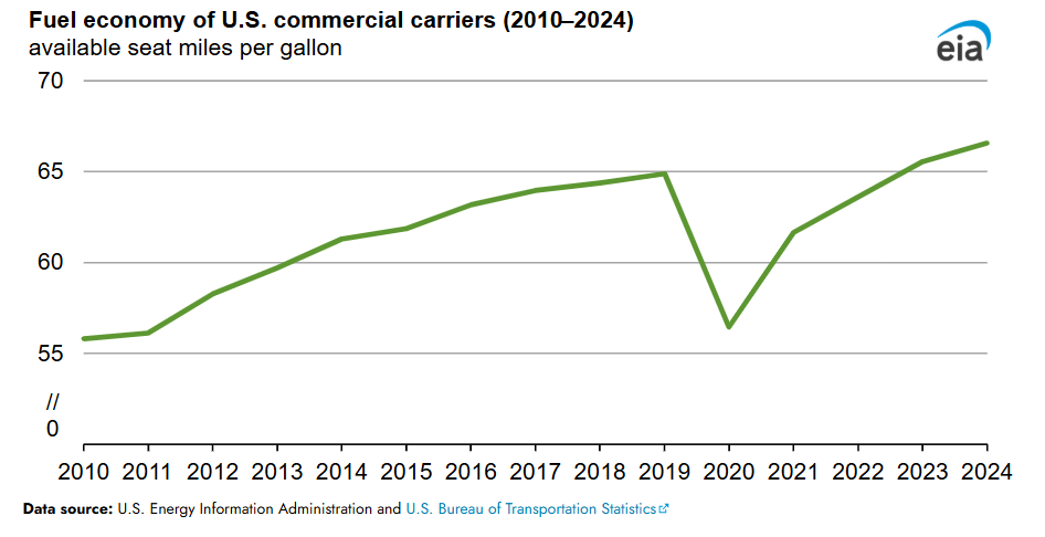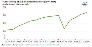 An increasingly fuel-efficient U.S. commercial aircraft fleet is also contributing to slowing growth in jet fuel consumption. The average fuel economy of U.S. carriers—in terms of available seat miles per gallon—increased from 56 available seat miles per gallon in 2010 to 67 available seat miles per gallon in 2024, up 19%.